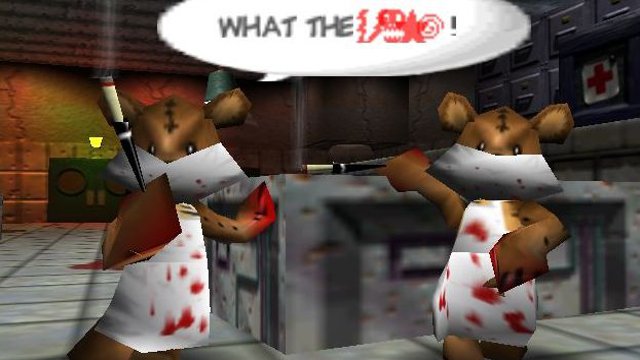 Ok, nu återgår vi till det där om censuren. I detta spel så förekommer en hel del udda saker som inte gjorts i tidigare spel. Conker’s Bad Fur Day har en stark South park humor. Ni som sett dessa avsnitt vet då vad jag menar. I spelet så dricker Conker så han blir full, vilket medföljer att hans rörelser plötsligt blir väldigt svåra att styra. Inte blir det bättre när han blir bakfull och går sakta runt och spyr då och då. Han pissar på sina fiender till och från också. Spelet är blodigt och rent groteskt ibland. Spelet har en hel del kiss coh bajshumor också. Vad som är en mer mogen sorts humor är alla små filmimitationer som finns genom äventyret. The Matrix, Rädda meniga Ryan, Hajen, Terminator och trollkarlen från Oz. Man kan göra ett eget spel bara genom att försöka hitta alla film-ripoffs. Missa inte Conker’s första möte med döden, det är ett av spelets höjdpunkter.